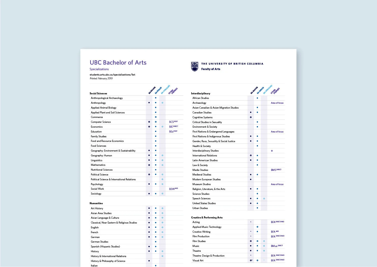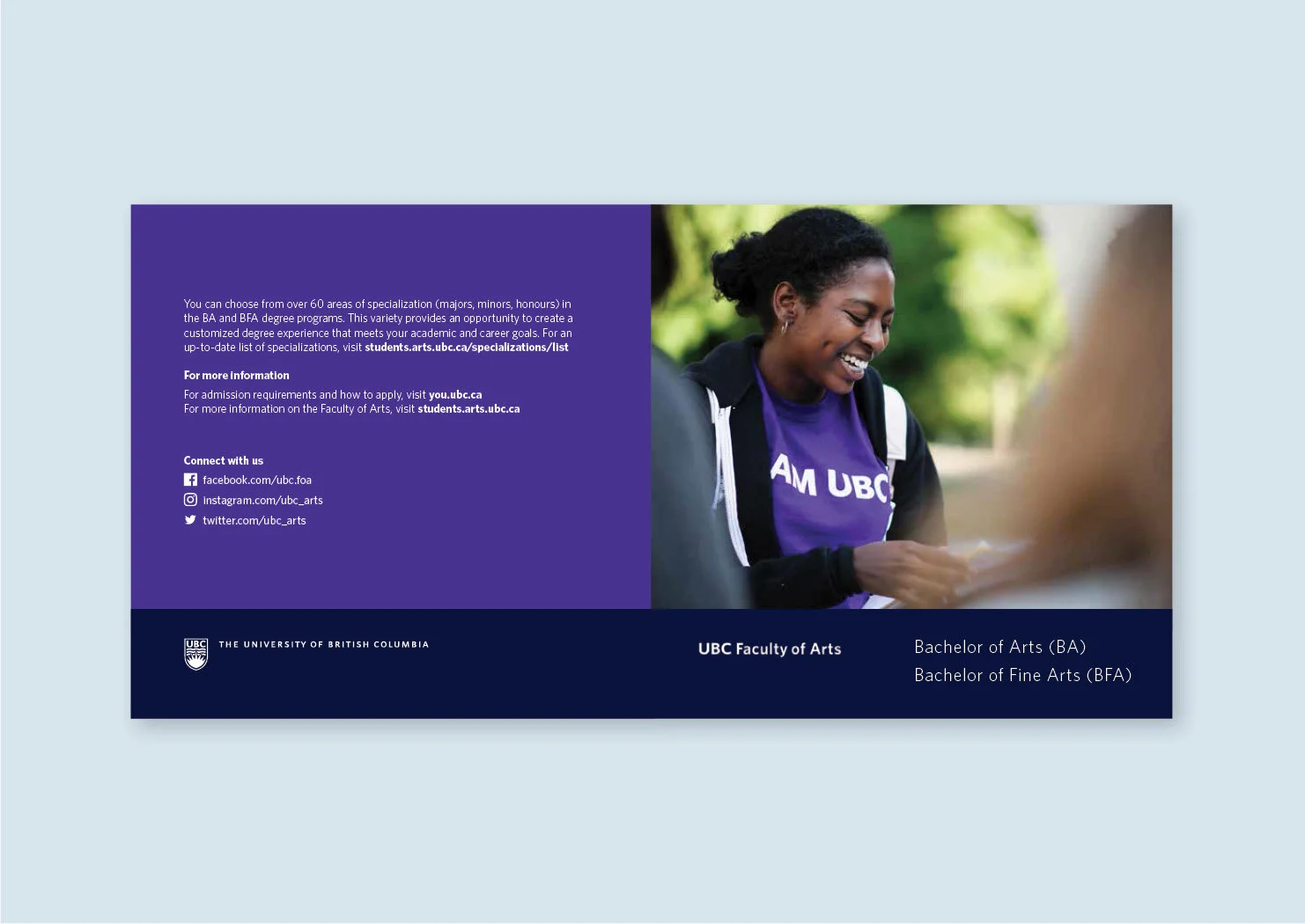 We had some basic building blocks to draw from for our marketing and communications materials: the Arts purple, student-focused imagery and photography, and UBC’s brand guidelines for typography. Using these pieces together in consistent ways helped us to achieve a more engaging and impactful faculty identity that both resonated with our audience and aligned with the university’s brand standards.