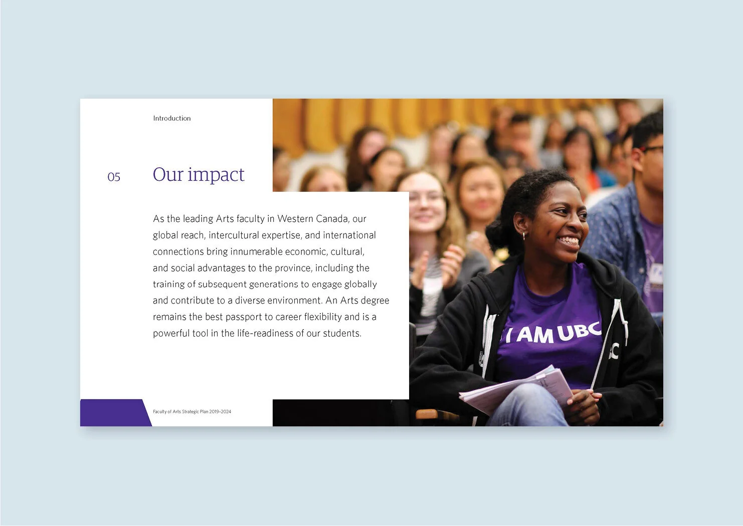 Recognizing an unidentified need, I spearheaded the development of a digital strategic plan for UBC’s Faculty of Arts. Working from their former plan, a basic presentation template, our in-house creative team restructured and transformed the content into an engaging PDF and corresponding microsite.