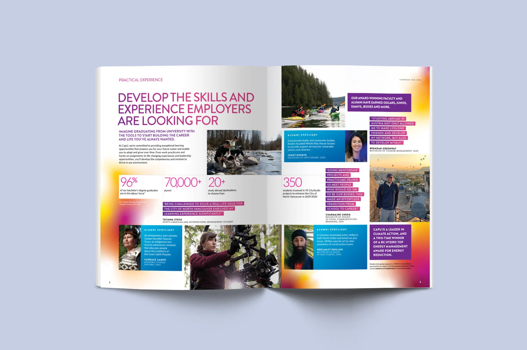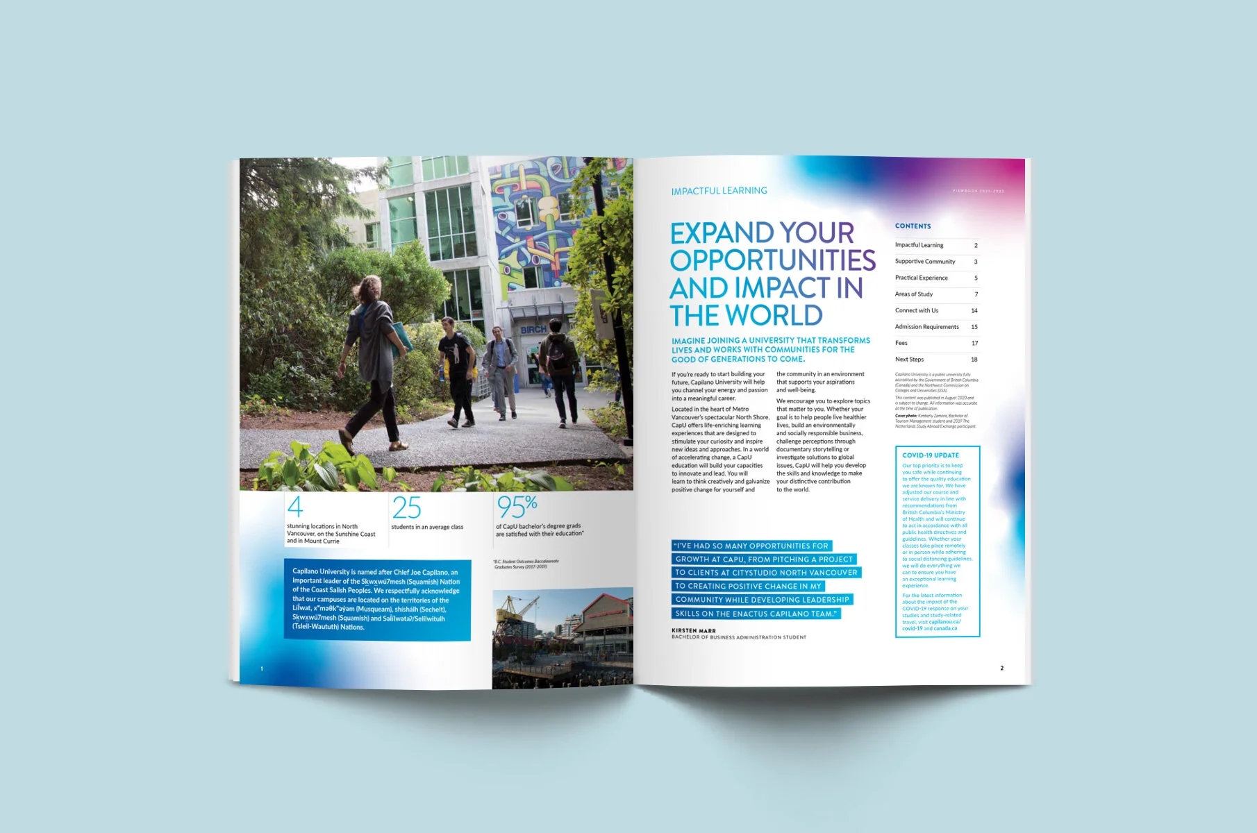 How do you approach the development of a university viewbook during the onset of the COVID-19 pandemic? This was a question we had to answer when faced with the 2021–22 CapU Viewbook. I stepped in to the project at a pivotal time, as production had begun prior to the global shutdown. When it became apparent that recruitment efforts would drastically change, some quick decisions had to be made.