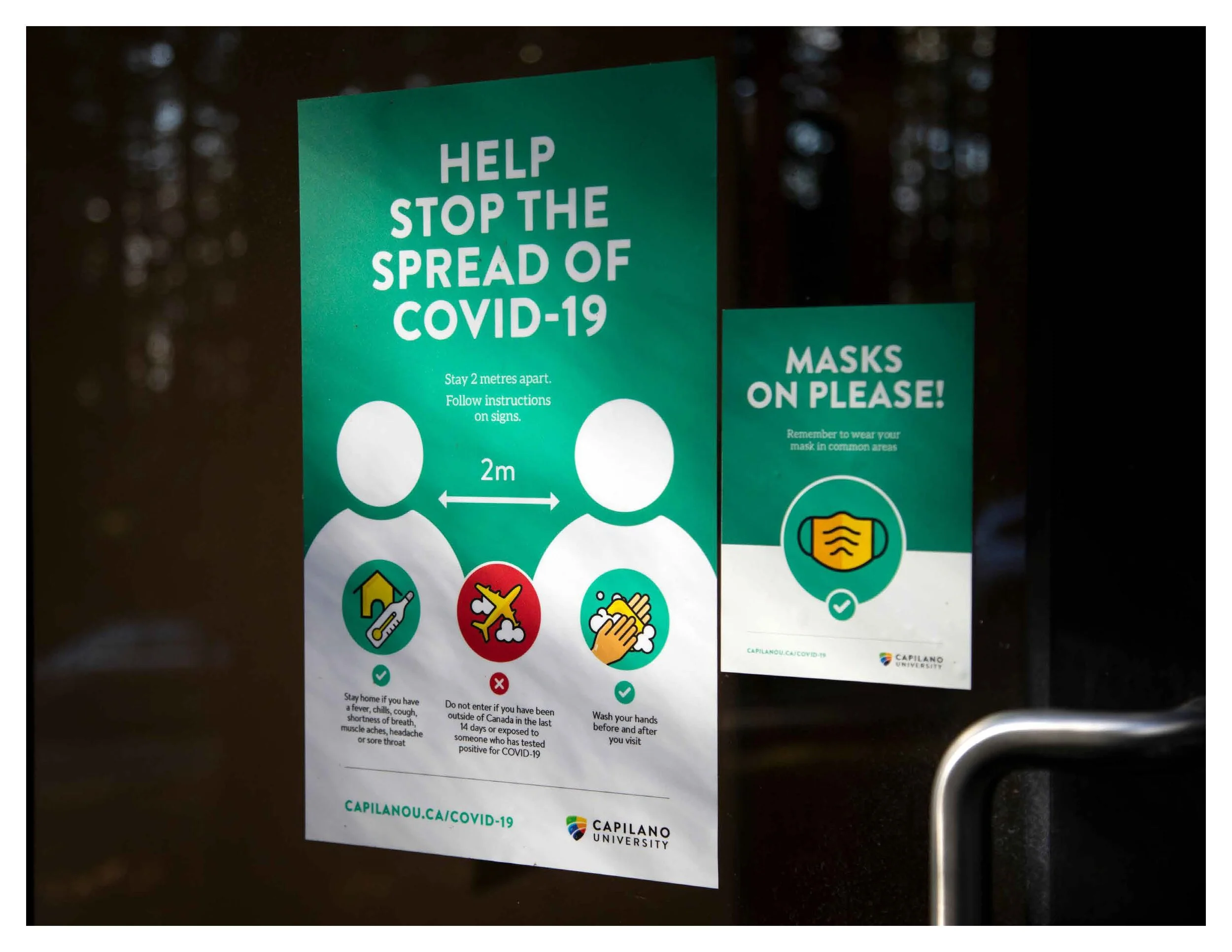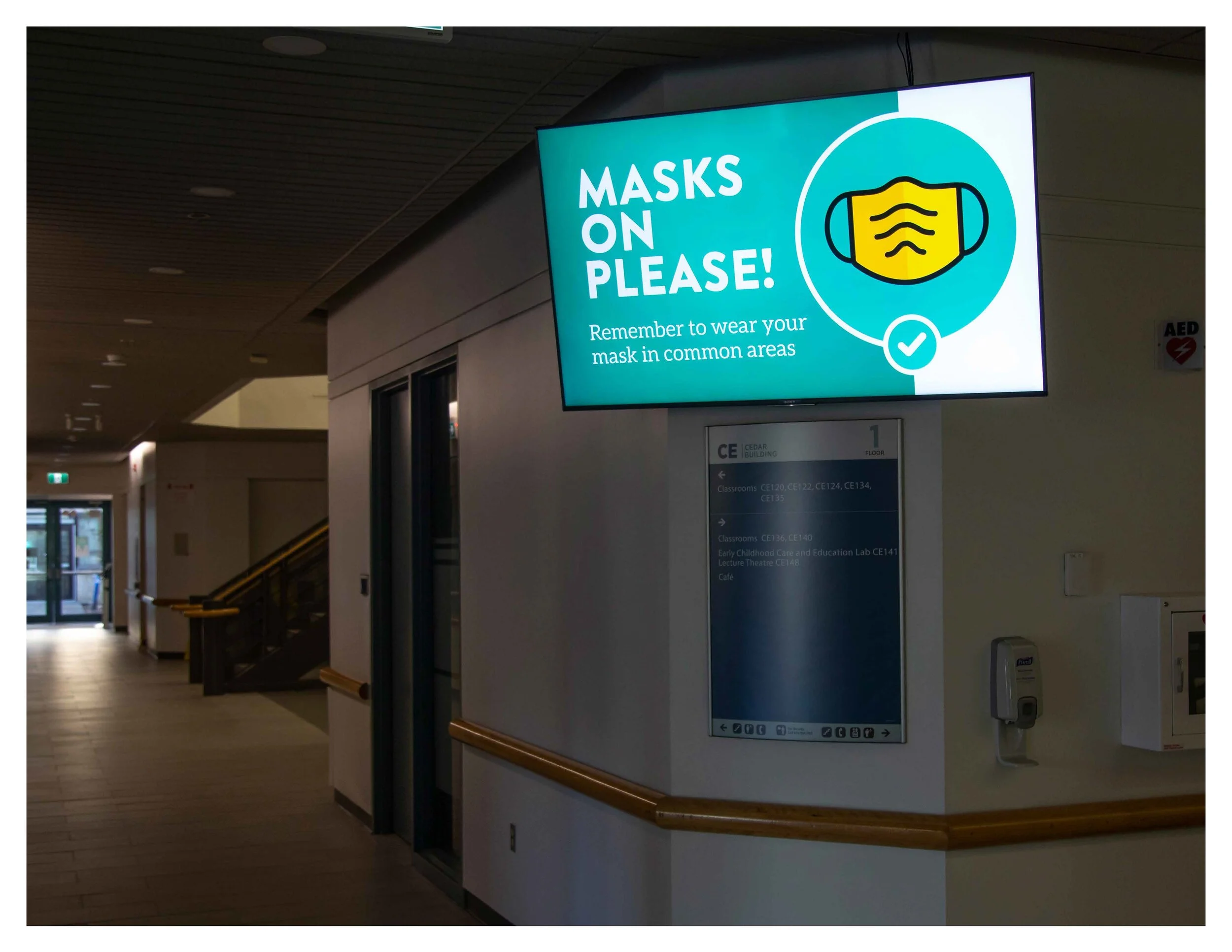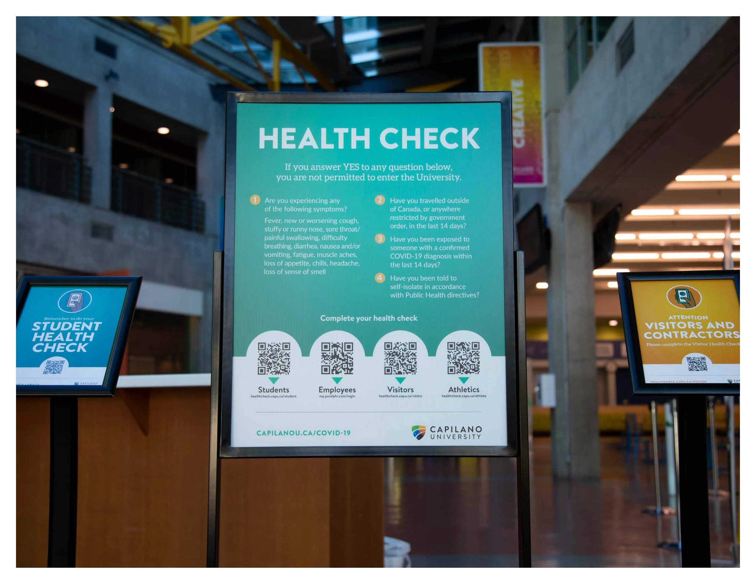 In response to the COVID-19 pandemic, we designed a clear and effective signage system to help students, employees and visitors to learn new health and safety protocols and navigate through campuses and buildings. The signage system covered everything from wellness checks and handwashing techniques to room occupancy limits and directions for movement.